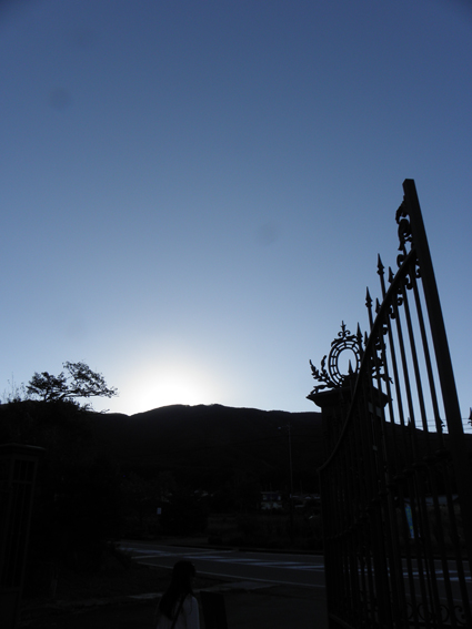 上の写真は帰る時に門の内側から太陽が山に沈んでいく様子を撮ったもの