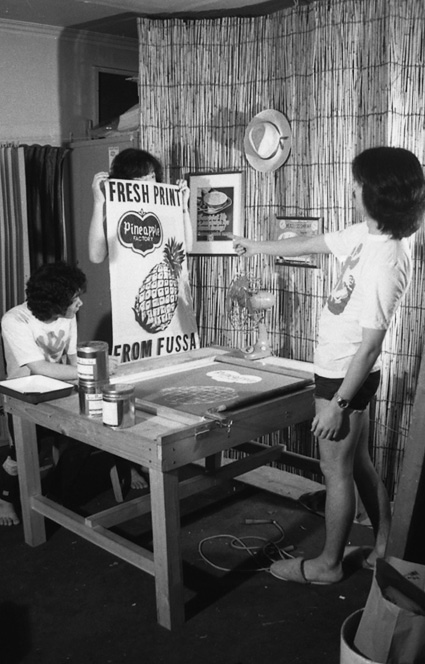 最初に東京の福生で始めた頃は刷り台は手作り製版は美学校時代に特注で作ってもらった物を、製版用のフィルムは写真の引伸し機を使って暗室作業で作っていましたし、プリントしたTシャツの熱処理もアイロンで1枚づつの手作業でした。